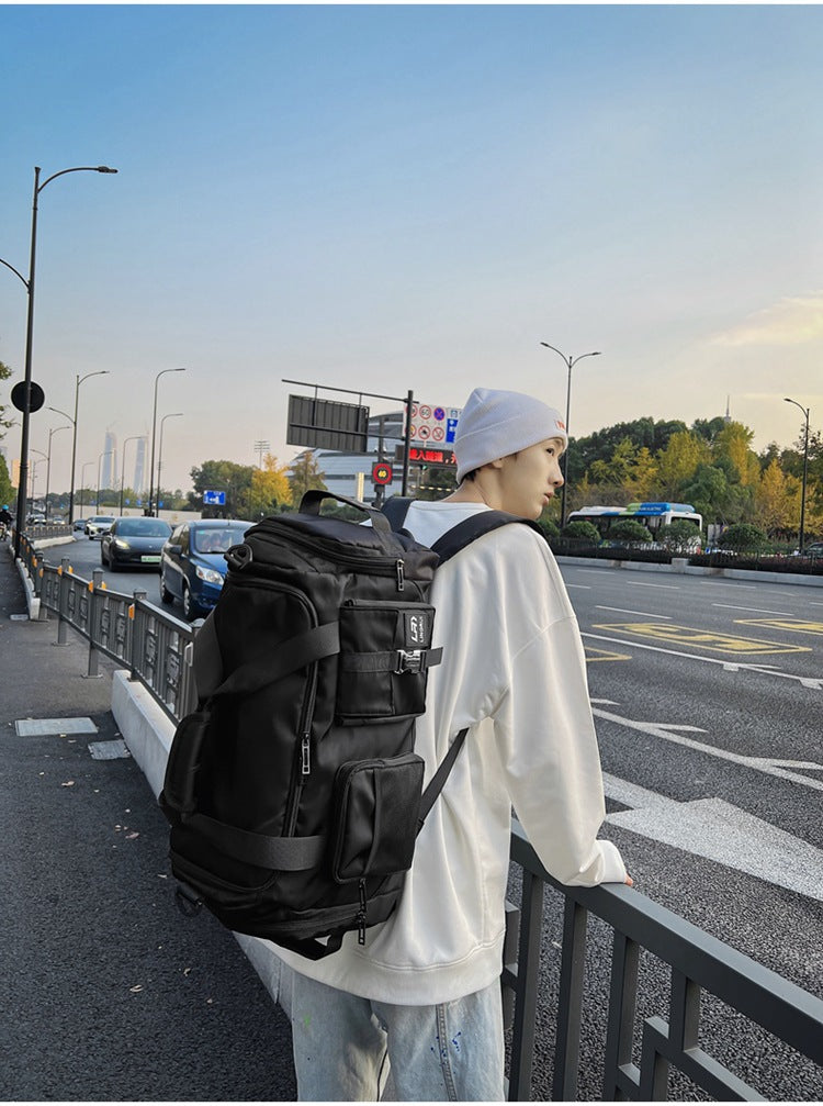 Black Unisex Travel Bag with Utility Buckles and Wet/Dry Compartments